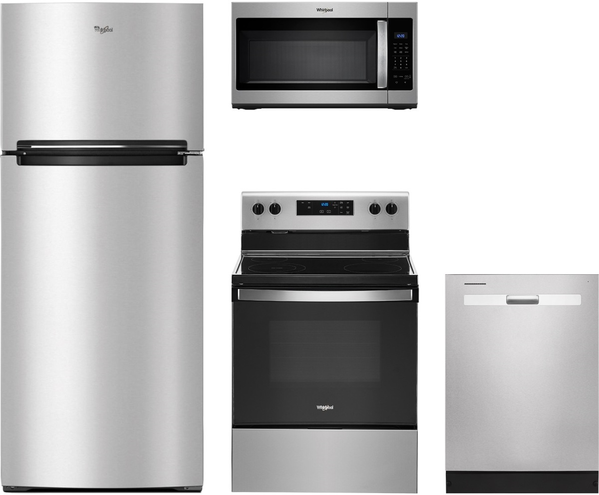 Whirlpool® 4 Piece Stainless Steel Kitchen Package with a built in dishwasher, over the range microwave, free standing electric range, and a top mount refrigerator.Read More